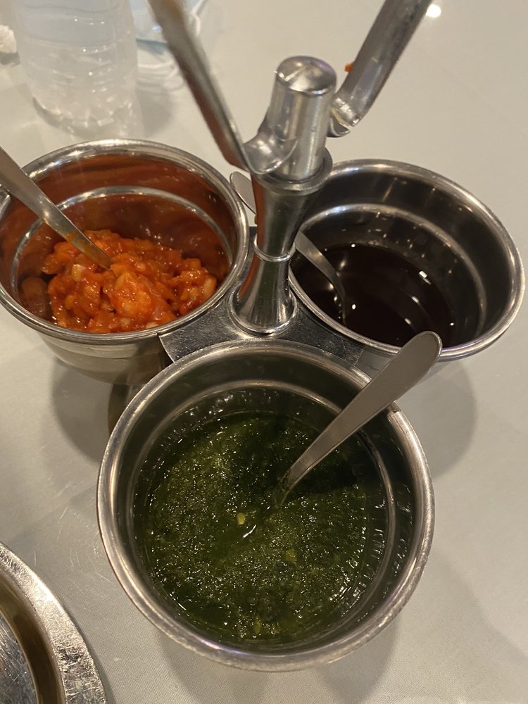 Homemade pickles and mango chutney with dry and fresh fruits.