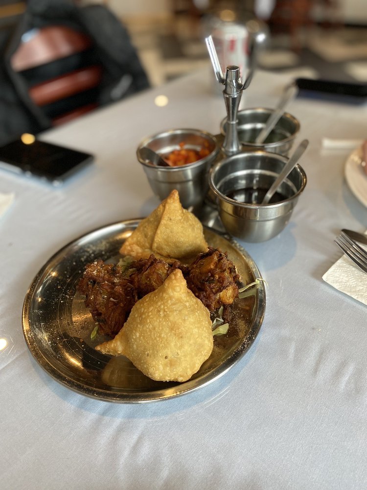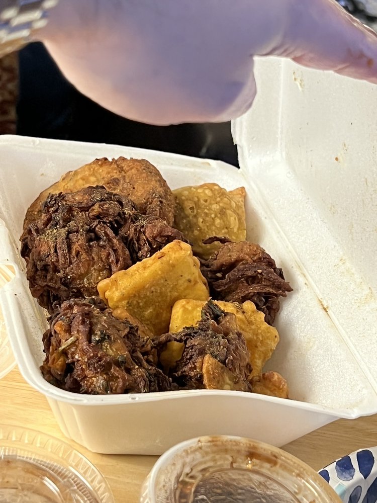Cauliflower, potatoes, onion, spinach, and spices, deep-fried in chickpea flour batter.